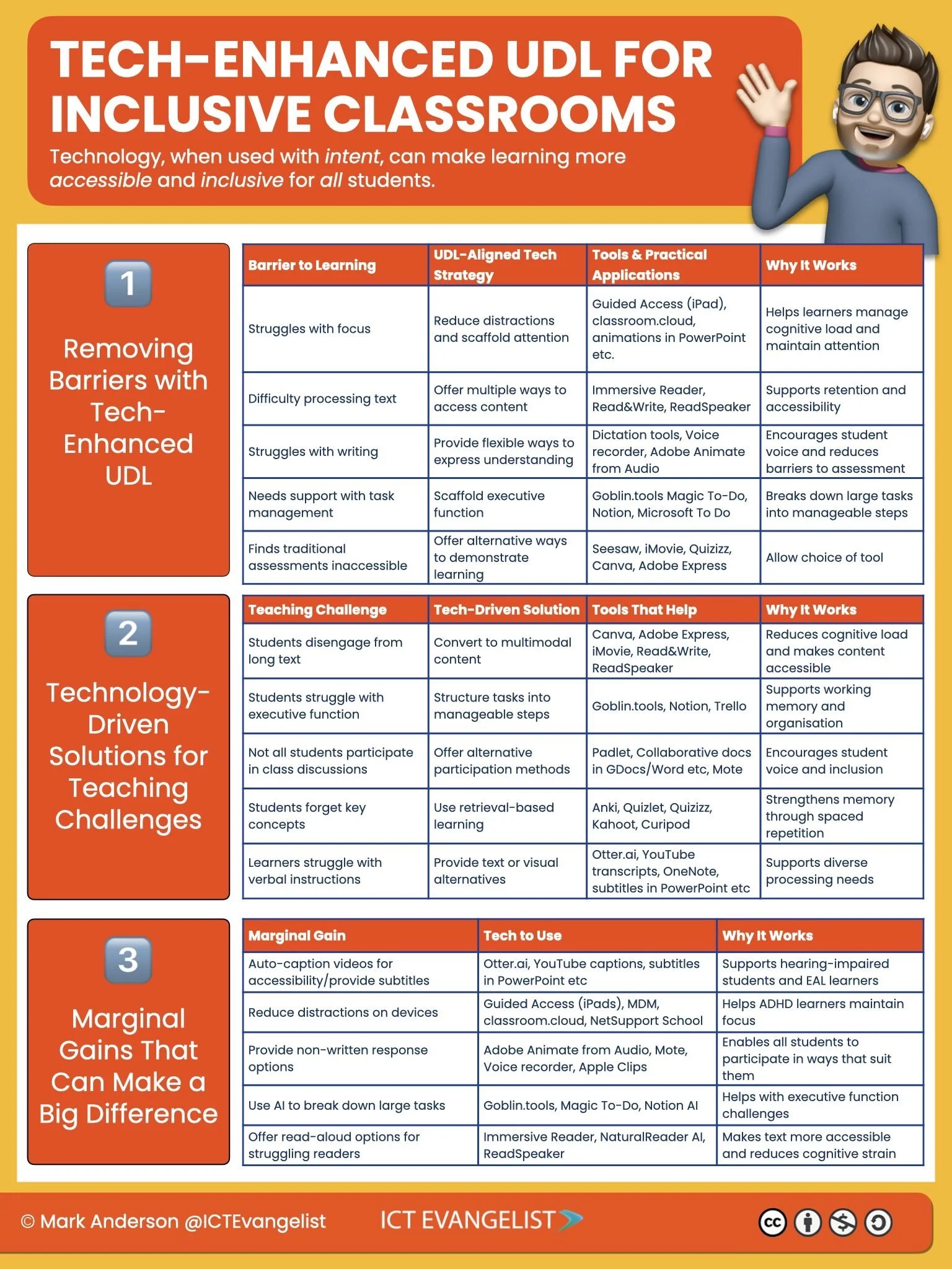- Check out the work of Mark Anderson Tech-Enhanced UDL for Inclusive Classrooms - ICTEvangelist